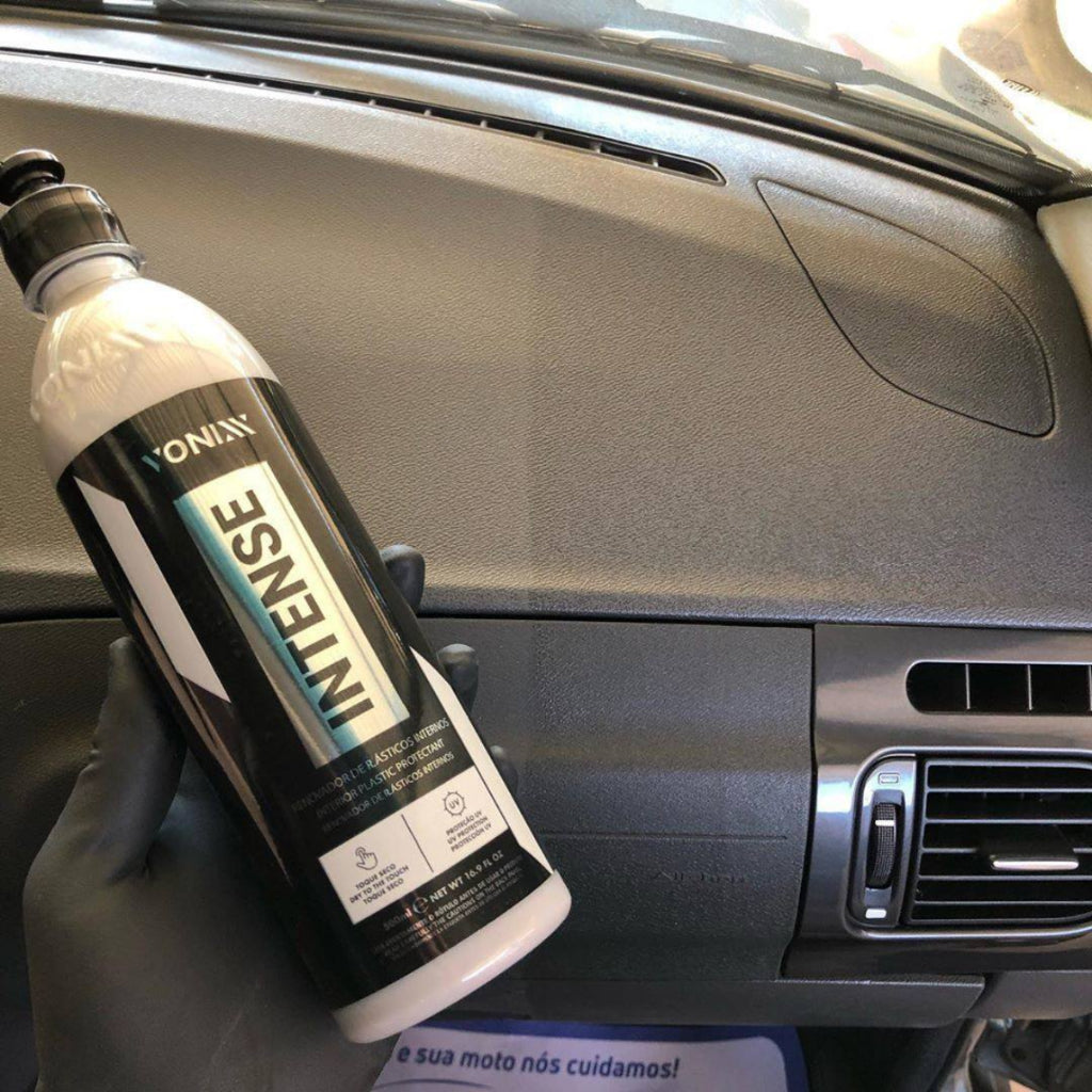 Intense é um renovador de plásticos com proteção UV, cuja fórmula balanceada promove acabamento natural e toque seco, com durabilidade de 6 meses.