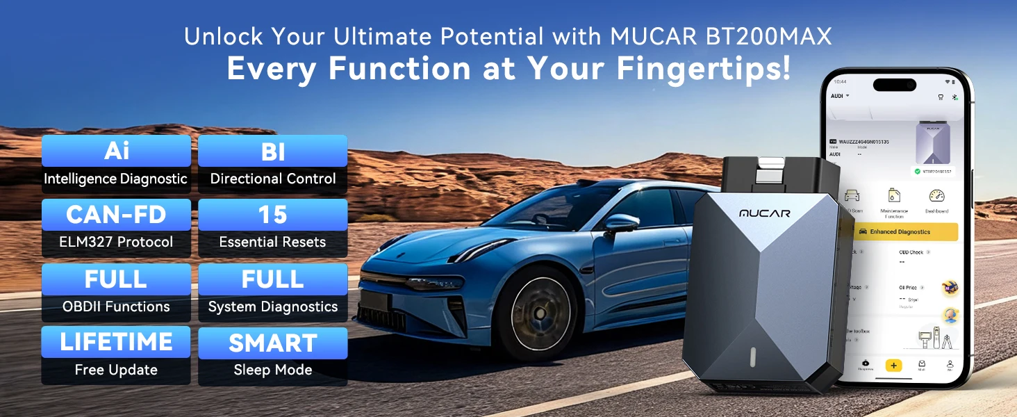 MUCAR BT200 Max sem necessidade de taxa de assinatura, sem restrições de IP, atualizações gratuitas vitalícias.É o primeiro scanner Bluetooth OBD2 com função de diagnóstico assistido por IA desenvolvido pela THINKCAR.Com design CAN FD integrado, suporta poderosa função de teste ativo de controle bidirecional.Ele também pode realizar diagnósticos completos do sistema completos e 15 serviços gratuitos de redefinição de manutenção.Além disso, ele não suporta apenas o acordo OBDII padrão, mas também adiciona protocolos ELM327 GM-LAN e Ford MS-CAN.Basta baixar o aplicativo Dollarfix e conectar seu telefone via Bluetooth para diagnóstico, proporcionando uma experiência de diagnóstico mais rápida, inteligente e suave.Fácil de colocar no bolso, fácil de transportar, ajuda a acompanhar o status do carro a qualquer hora e em qualquer lugar, garantindo segurança ao dirigir e economizando tempo e dinheiro significativos.